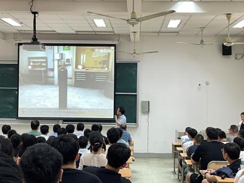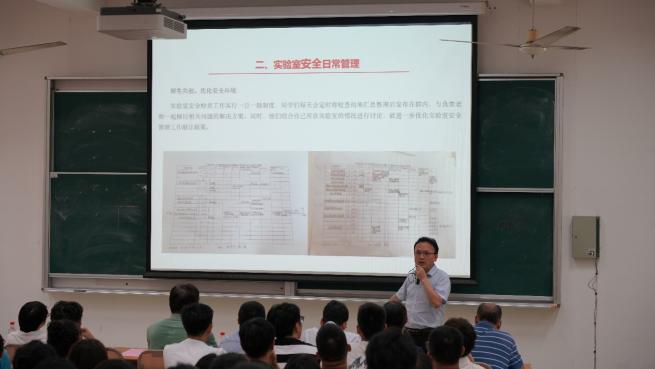 副院长肖胜雄老师对新生进行实验室安全教育,重点介绍了气体钢瓶统计情况和安全消防设备统计情况等实验室的基本概况。肖老师播放的由气体钢瓶使用、存放不当带来的事故视频触目惊心。在进入课题组实验室之前,同学们必须做到心中有数,防患于未然。最后,肖老师讲解了实验室安全防护措施,提醒大家时刻铭记安全第一、预防为主的安全原则,不断加强安全知识的学习,养成良好的操作习惯,培养科学的安全管理措施。