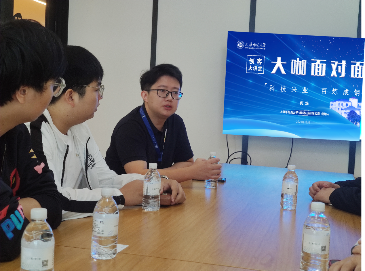 2023年10月31日上午,卫星直播足球 学术科创月之“大咖面对面”创客大讲堂在上海中心大厦13楼会议室举行。上海禾枢高分子材料科技有限公司创始人、卫星直播足球 2019届高分子化学与物理专业研究生校友何炼作为主讲嘉宾,向参加分享会的在校学生代表们介绍了自己的创业历程和心得体会。卫星直播足球 党委副书记、副院长(兼)臧艳雯老师参加活动。分享会由卫星直播足球 研究生辅导员、卫星直播足球 双创工作负责人吉鹏亮老师主持。