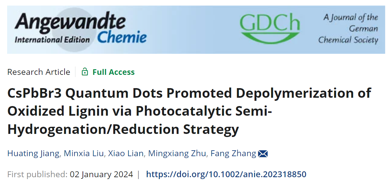 2024年1月,卫星直播足球 张昉团队在Angewandte Chemie International Edition在线发表题为“CsPbBr3 Quantum Dots Promoted Depolymerization of Oxidized Lignin via Photocatalytic Semi-Hydrogenation/Reduction Strategy”的研究文章。该研究首次利用钙钛矿量子点催化解聚木质素,为解决木质素由于自身特征(成分复杂、结构稳定和分子尺寸较大等)难以有效利用提供了一种新策略。