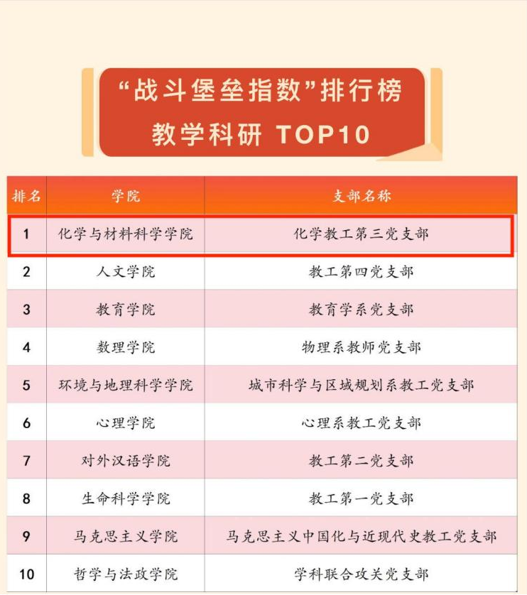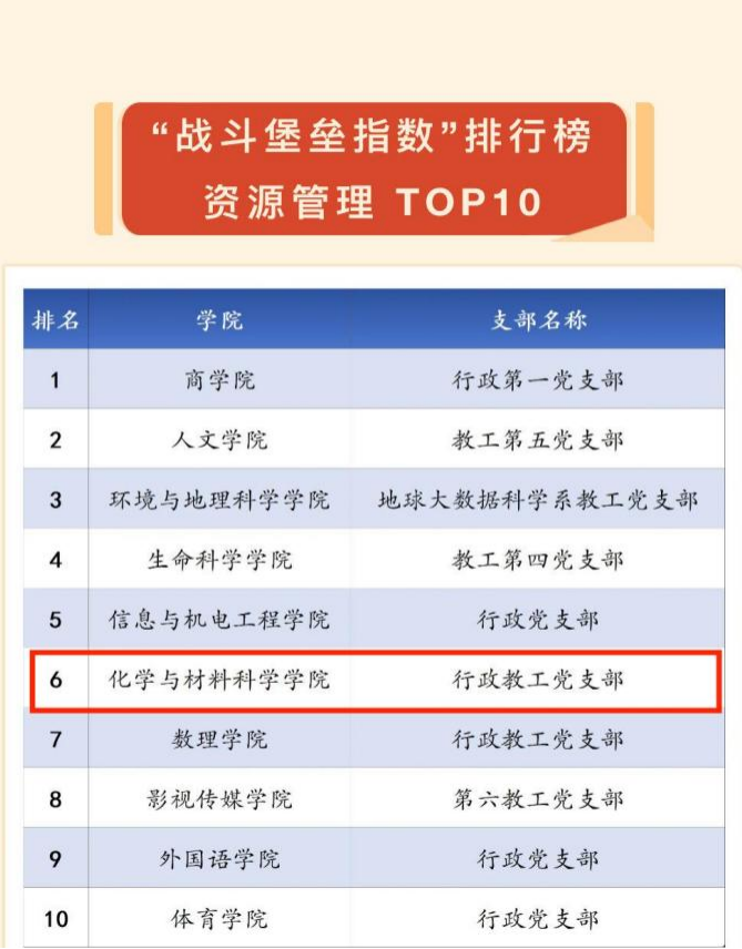 为深入学习贯彻习近平新时代中国特色社会主义思想和党的二十大精神,进一步增强教工党支部政治功能和组织功能,推动党建工作和业务工作深度融合,以高质量党建推动学校事业高质量发展,校党委组织部在汇总分析2023年度有关数据的基础上,分类推出第六期教工党支部“战斗堡垒指数”排行榜。免费足球直播app 化学教工第三党支部荣登“战斗堡垒指数”教学科研TOP10排行榜;行政教工党支部荣登“战斗堡垒指数”资源管理TOP10排行榜;