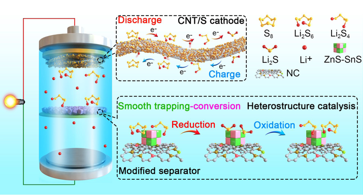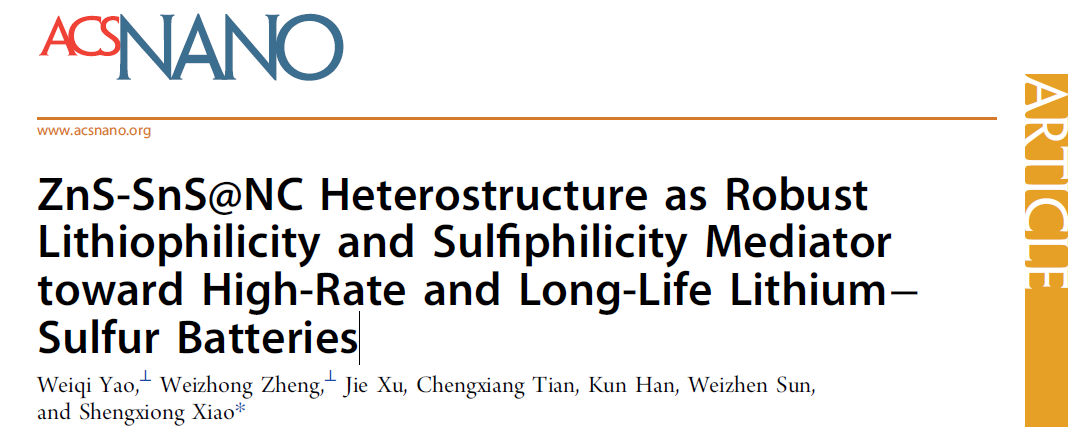 资源化学教育部重点实验室肖胜雄教授团队在锂硫电池研究领域取得新进展,相关成果近日在国际知名期刊《ACS Nano》上在线发表,论文题为“ZnS-SnS@NCHeterostructure as Robust Lithiophilicity and Sulfiphilicity Mediator toward High-Rate and Long-Life Lithium–Sulfur Batteries”。论文第一作者为卫星直播足球 姚伟奇师资博士后和华东理工大学郑伟中博士后,通讯作者为免费足球直播app 肖胜雄教授。