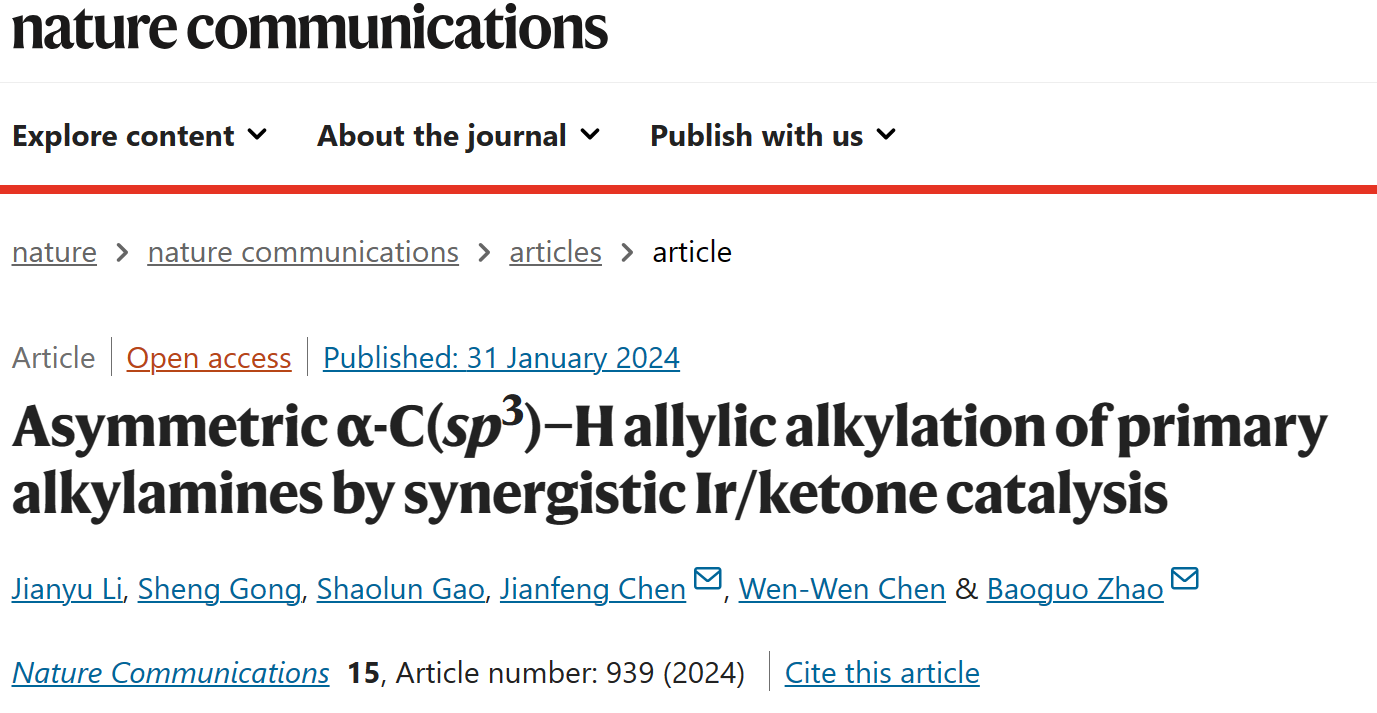 近期,化材卫星直播足球 赵宝国教授、陈剑锋副研究员团队在羰基催化伯胺α-C-H不对称官能化研究中取得重要进展,在《Nature Communications》上发表题为 “Asymmetric α-C(sp3)−H allylic alkylation of primary alkylamines by synergistic Ir/ketone catalysis”的研究论文。该研究运用酮/铱协同催化策略,成功地实现了烷基伯胺α-C-H键的不对称烯丙基烷基化反应,为具有重要生理活性的手性胺类化合物提供了高效便捷的合成新方法。2019级博士研究生李健羽为论文第一作者,赵宝国教授和陈剑锋副研究员为论文通讯作者。