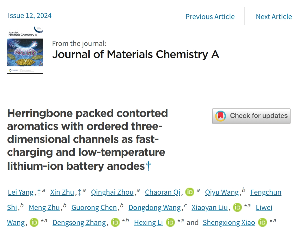 最近,卫星直播足球 肖胜雄教授和刘肖燕副研究员团队在锂离子电池快充及低温性能研究中取得重要进展,在《Journal of Materials Chemistry A》上发表题为“Herringbone packed contorted aromatics with ordered three-dimensional channels as fast-charging and low-temperature lithium-ion battery anodes”的研究论文。该研究采用“自下而上”的原子精度精准合成的方法创制了一种高性能的非平面分子自组装的有机负极材料(c-HBC-8O),以此制备的锂离子电池在常温和低温环境下均表现出良好的快速充放电能力和较高的比容量。