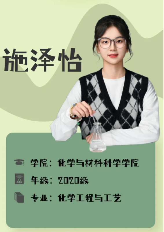 施泽怡在大学期间致力于专业知识的学习,积极提升学术素养,形成了高效的学习和生活习惯。她严谨地对待每一门课程,通过定期自测不断自我完善。她深知科研和实验在化学领域中的重要性,因此在课余时间投入了大量精力。她作为负责人主持《拉曼光谱结合微针进行指标监测》校级大学生创新创业训练项目,通过扎实研究,项目获得了大学学生科研项目三等奖的荣誉。