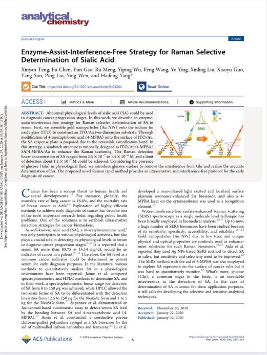 读研期间,滕欣妍选择了分析化学专业表面增强拉曼光谱方向。滕欣妍深知科研没有捷径,为了尽快解决难题,她几乎调研了相关领域的所有论文,跑了上百次实验室,整理了一沓又一沓数据,有时在电脑前一坐就是一整天。在无数次尝试和探索后,终于迎来了曙光,她研究开发了一种新型的广谱型癌症标志物检测技术,可用于癌症的早期诊断筛查。相关成果以第一作者在领域权威期刊Analytical Chemistry上发表。