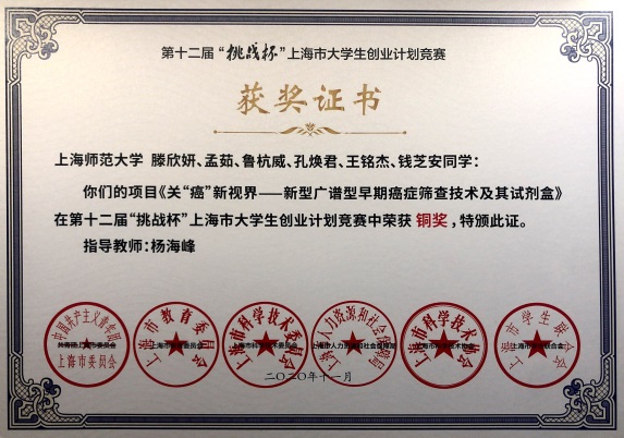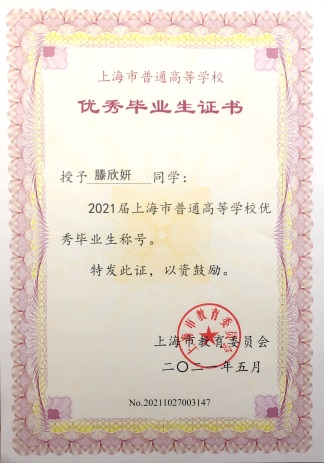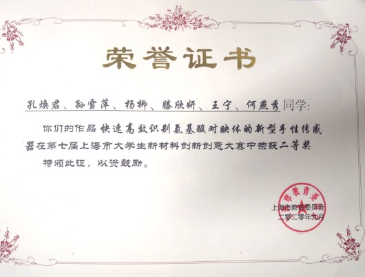 于是,滕欣妍与团队成员一起,在疫情期间报名参赛,最终斩获第六届中国国际“互联网+”大学生创新创业大赛上海赛区银奖、铜奖,第七届上海市大学生新材料创新创意大赛二等奖、第十二届“挑战杯”上海市大学生创业计划竞赛铜奖,第十八届上海市百万青少年争创“明日科技之星”评选活动暨上汽教育杯上海市高校学生科技创新作品展示评优三等奖等成绩。