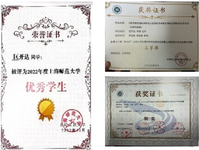 三年里他参与各级各类科研竞赛10余次,连续两年获得学业奖学金二等奖,被评为2022年上海师范大学优秀学生。
