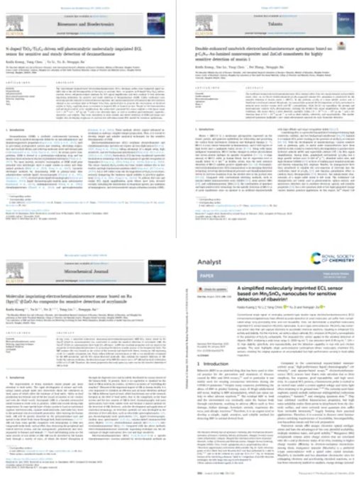 硕士期间已录用学术论文4篇,以一作身份发表二篇一区TOP论文,(Biosensors and Bioelectronics IF 12.6,Talanta IF 6.1),共以第一身份发表论文二篇(Microchemical Journal IF 4.8,Analyst IF 4.2)。