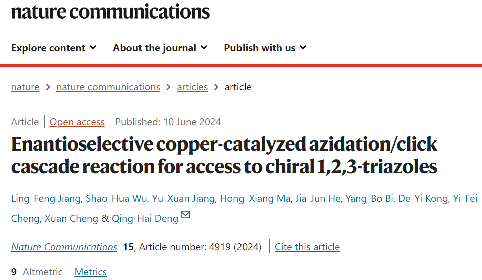 近日,卫星直播足球 邓清海教授团队在手性1,2,3-三氮唑化合物的合成研究中取得重要进展,相关成果以“Enantioselective copper-catalyzed azidation/click cascade reaction for access to chiral 1,2,3-triazoles”为题发表于《Nature Communications》。该方法通过巧妙的底物设计,结合不对称叠氮化与点击化学两种反应策略,通过串联反应实现了一系列1,5-二取代和1,4,5三取代手性1,2,3-三氮唑化合物的高效合成。上海师范大学为唯一通讯单位,我校2020级博士生江岭峰为论文第一作者,邓清海教授为论文通讯作者。