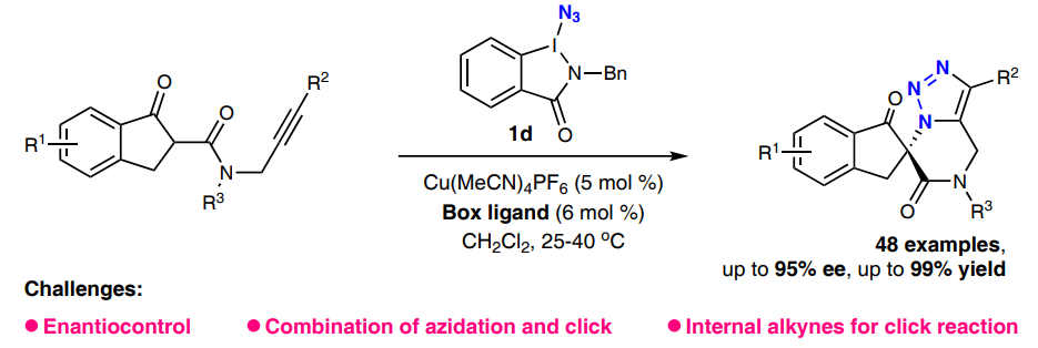 1,2,3-三氮唑作为高价值的骨架结构被广泛应用于药物发现、生物正交化学、合成化学和材料科学等领域。自从Sharpless和Meldal等人报道铜催化叠氮化物与炔烃的点击(Click)化学反应以来,由于该反应的高效性和优异的生物相容性,已成为高效合成外消旋1,2,3-三氮唑的重要方法。由于三氮唑骨架中没有sp3手性中心,以及叠氮化物和炔烃的线性几何结构等因素,手性三氮唑的合成仍然是一个富有挑战性的课题。近年来,通过(动态)动力学拆分或去对称化策略,成功实现了一系列铜催化的不对称点击反应,并构建出1,4-二取代的手性三氮唑化合物,但是对于1,5-二取代的手性三氮唑化合物的合成仍然鲜有报道。