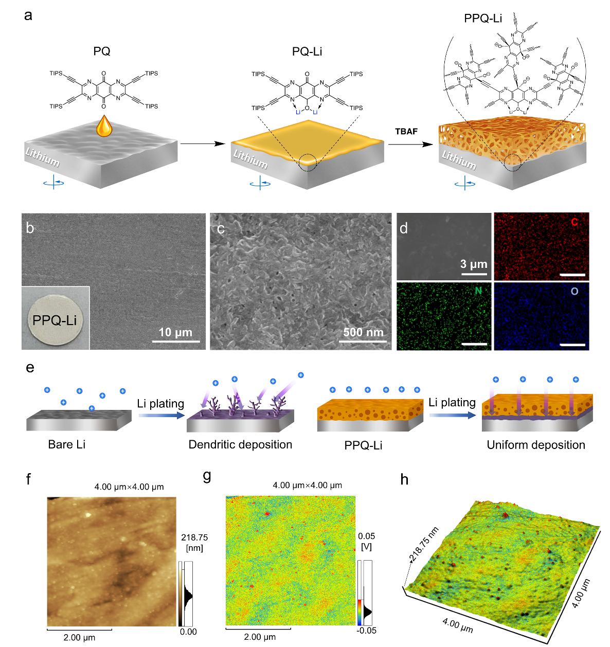 图例说明:PPQ人工保护膜在锂金属表面的合成及其抑制锂枝晶生长效果示意图。