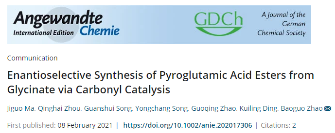 2月8日,资源化学教育部重点实验室赵宝国教授团队在仿生羰基催化不对称 Michael加成反应中取得进展,相关成果以“Enantioselective Synthesis of Pyroglutamic Acid Esters from Glycinate via Carbonyl Catalysis.”为题发表在《Angewandte Chemie International Edition》上。论文第一作者是免费足球直播app 硕士研究生马继国同学,由我校赵宝国教授和中科院上海有机化学研究所丁奎岭院士共同指导。
