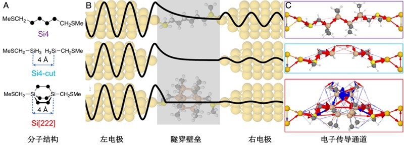研究人员设计合成了带有甲硫基的Si[2.2.2]桥环硅烷(图A中Si[222]),将其与直链硅烷(图A中Si4)及模拟真空(图A中Si4-cut)的导电性进行对比,研究导电通路对分子电导的影响
