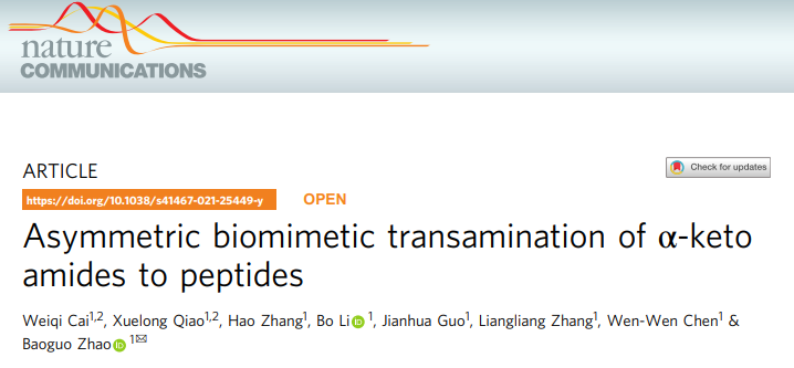8月30日,上海市仿生催化前沿科学研究基地(培育)的赵宝国教授团队在不对称仿生转氨化反应方面取得进展,相关成果以“Asymmetric Biomimetic Transamination of α-Keto Amides to Peptides”为题发表在《Nature Communications》上。免费足球直播app 19级博士研究生蔡玮琦和15级硕士研究生乔雪龙为论文共同第一作者,赵宝国教授为论文通讯作者。