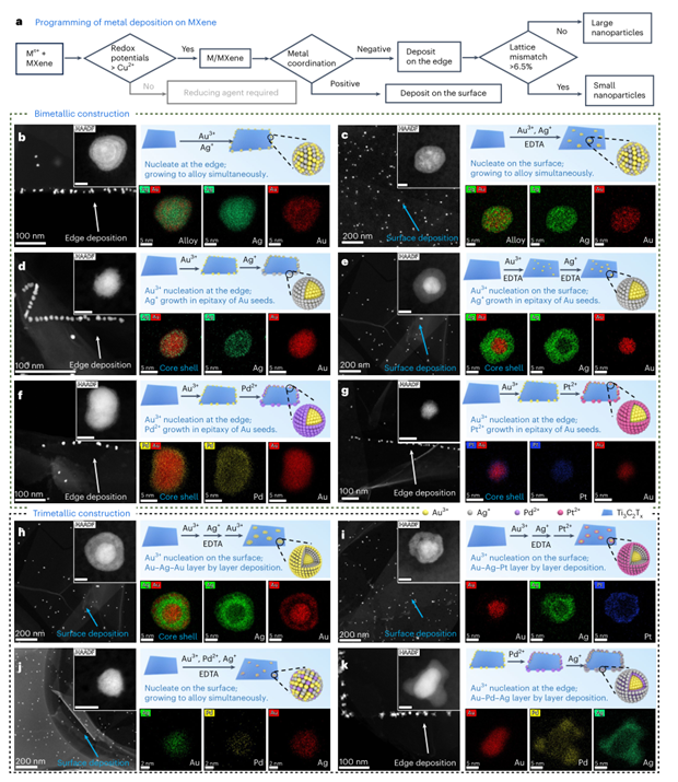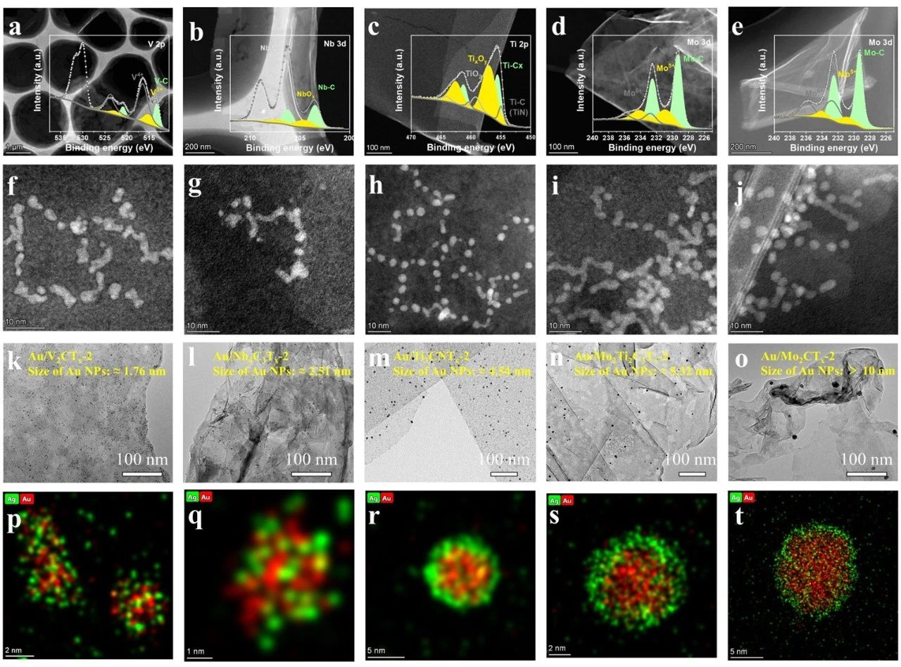 基于上述指导原则,团队成功合成了多种预测结构的M/Ti3C2Tx复合材料,如AgAu-Edge/Ti3C2Tx,AgAu-Surface/Ti3C2Tx,Ag@Au-Edge/Ti3C2Tx,Ag@Au-Surface/Ti3C2Tx,Pd@Au-Edge/Ti3C2Tx,Pt@Au-Edge/Ti3C2Tx (g), Au@Ag@Au-Surface/Ti3C2Tx,Pt@Ag@Au-Surface/Ti3C2Tx,AgPdAu-Surface/Ti3C2Tx和Ag@Pd@Au-Edge/Ti3C2Tx纳米结构等。