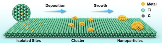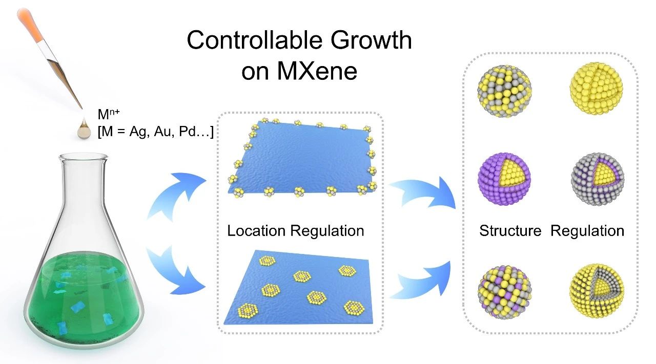 金属/二维材料复合物在众多领域具有巨大的应用潜力。然而,其合成过程涉及金属前驱体、载体、还原剂、溶剂,甚至是结构导向剂之间错综复杂的相互作用,难以实现金属的精准调控。为了克服这一难题,团队基于二维MXene材料上金属原位还原(自还原)策略,系统研究了金属在MXene表面成核和生长过程,总结出控制材料结构的三条指导原则:(1) 氧化还原电位决定金属能否还原。(2) Mn+的配位环境决定金属在MXene上的沉积位置。(3) 金属与MXene的晶格匹配度决定沉积金属的尺寸。