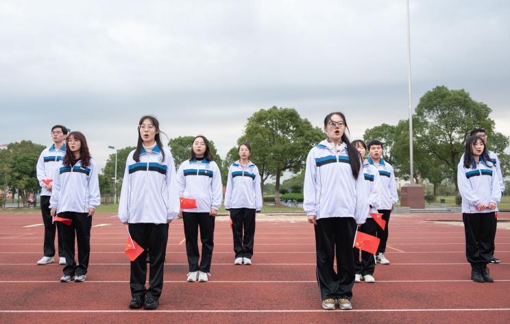 三位退伍兵步伐矫健,昂首阔步地出旗;同学们注目国旗,眼里饱含爱国热情,嘴唇翕合之间,昂扬的歌声,盘旋在操场上空,久不能绝。