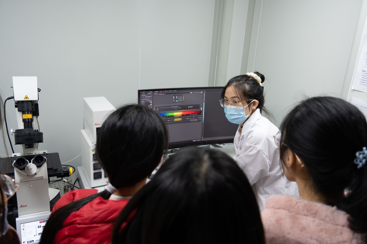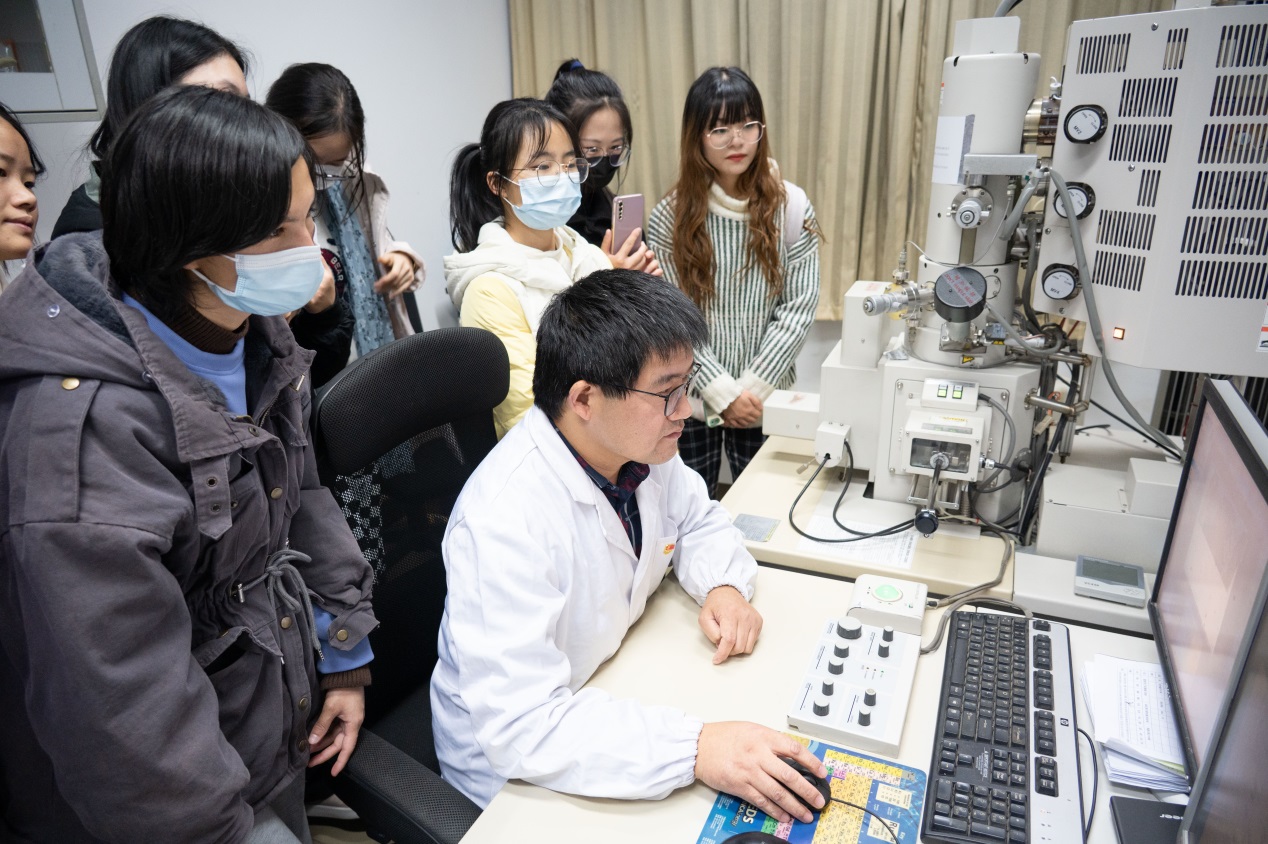 随后,40余名同学分成5个小组,在教师和研究生学长、学姐的带领下,依次参观了分析测试中心、电化学实验室等5个实验室。同学们先后参观了分析测试中心的TEM、SEM、核磁等大型仪器,观看了SEM的讲解和演示,观摩了电化学工作站、拉曼光谱仪、红外光谱仪、荧光成像仪等仪器的讲解和演示,以及电纺和电致发光的演示实验。