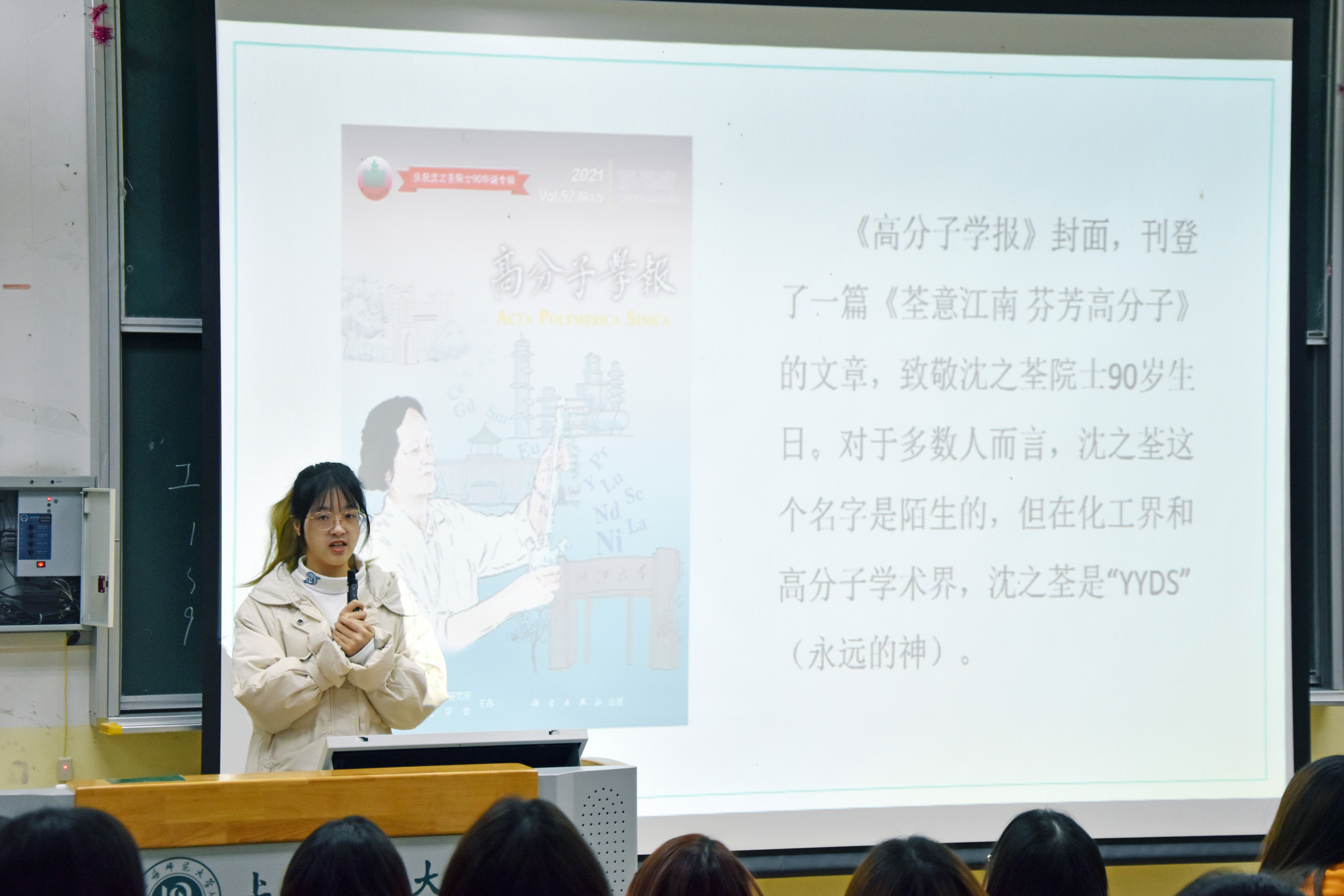 张娓娓由《高分子学报》上刊登的《荃意江南 芬芳高分子》一文,引入沈之荃教授及其提出的“三元镍系催化体系对丁二烯的定向聚合和镍顺丁橡胶的结构性能”的研究课题。张娓娓为同学们介绍了三元镍系顺丁橡胶的合成机理和合成的工艺过程,讲述了沈之荃教授在寻找镍系催化体系制备顺丁橡胶过程中遇到的困难及解决方法,以及三元镍系顺丁橡胶的工艺合成过程和应用,引导同学们学习沈之荃教授全情科研的科学精神,感受科学前辈从事科研工作时不畏艰难、严谨细致的优良作风。