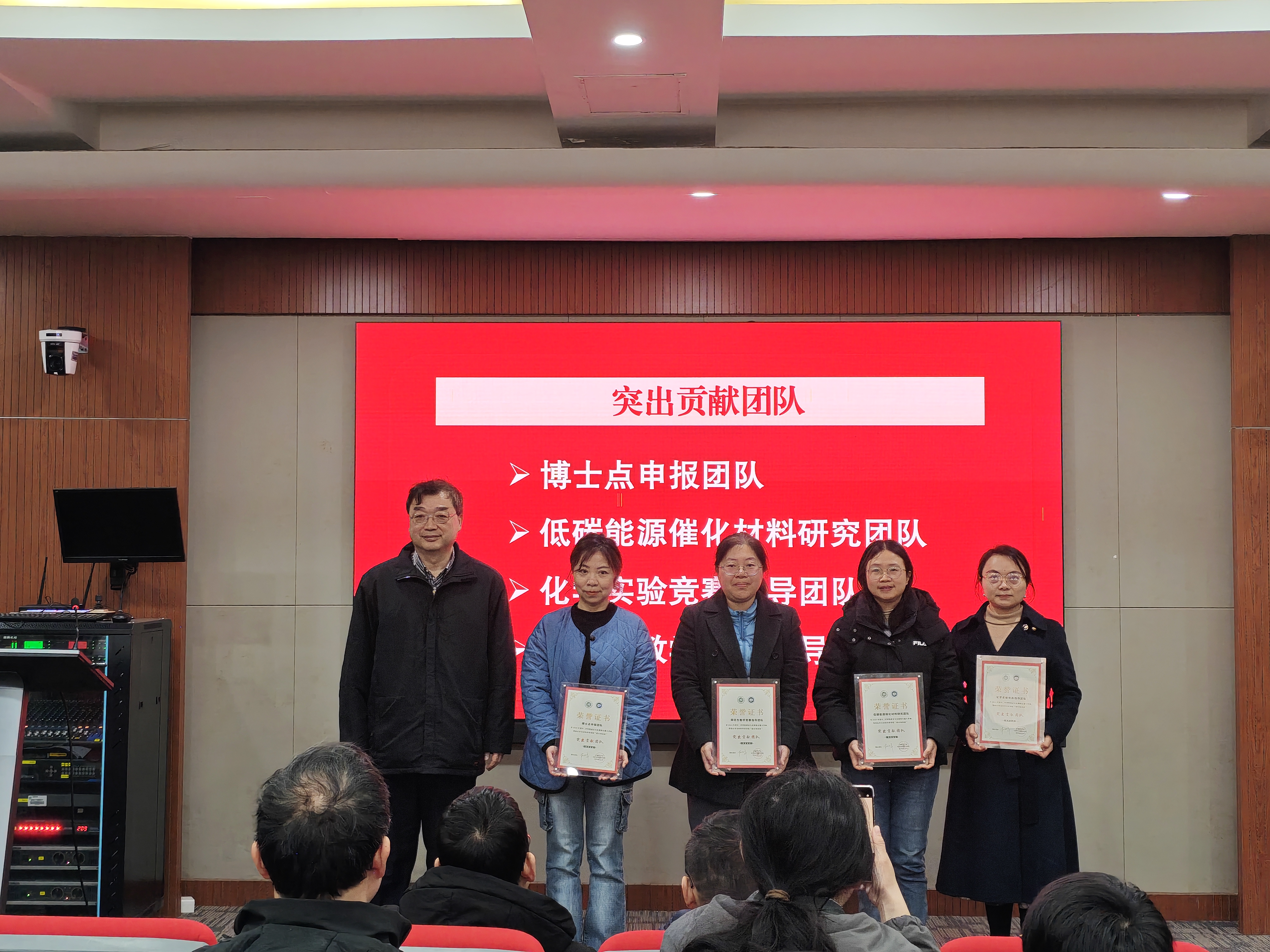 首先,卢书记宣读荣获2024年度“院长特别奖”突出贡献团队:博士点申报团队、低碳能源催化材料研究团队、化学实验竞赛指导团队以及师范生教学竞赛指导团队。杨仕平院长为获奖团队逐一颁发获奖证书,向获奖团队表示衷心的祝贺并合影留念。