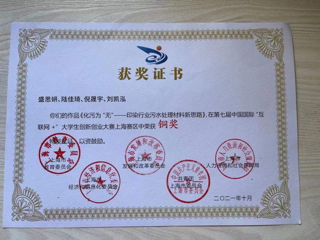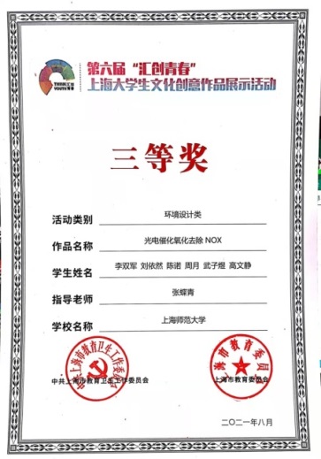 研究生孙心悦、江欢、王敏获得第八届上海市大学生新材料创新创意大赛三等奖。