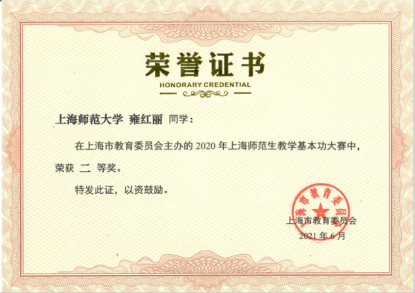 本科2017级雍红丽获得2020年上海师范生教学基本功大赛二等奖。