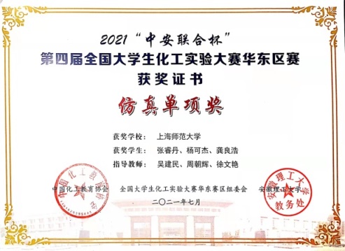 本科2018级李健玲、周佳欣、程镇获得2021“中安联合”杯第四届全国大学生化工实验大赛华东区赛仿真单项奖。