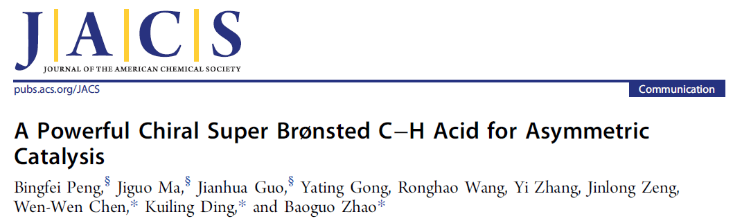 上海有机化学研究所丁奎岭院士团队联合发展了一类具有超强酸性的新型手性Brønsted碳酸,相关成果以“A Powerful Chiral Super Brønsted C–H Acid for Asymmetric Catalysis”为题发表在《Journal of American Chemical Society》上。21级博士生彭兵飞、上海师范大学和上海有机化学研究所联合培养的16级硕士生马继国和19级硕士生郭建华为论文共同第一作者,上海师范大学赵宝国教授、陈雯雯副研究员、上海有机化学研究所丁奎岭院士为论文共同通讯作者。
