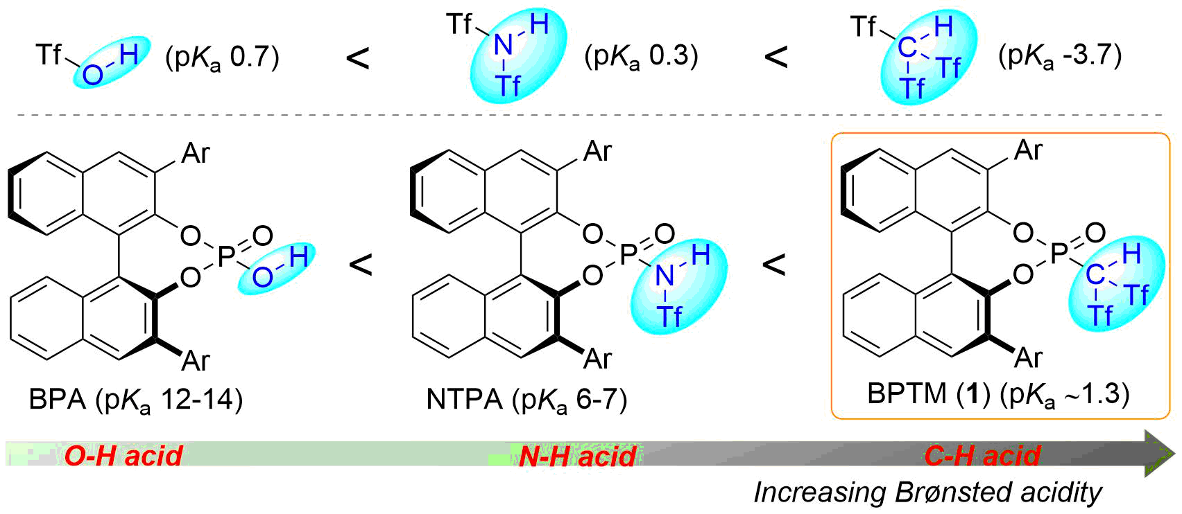 手性Brønsted酸是一类重要的有机催化剂,可以有效地实现许多对映选择性构建碳-碳键和碳-杂键的反应。酸性在不对称Brønsted酸催化中至关重要,一般来说,酸性越强,反应活性越高。迄今为止,手性Brønsted超强酸报道非常有限,发展新型手性Brønsted超强酸催化剂具有重要意义。赵宝国教授、陈雯雯副研究员团队和中国科卫星直播足球 上海有机化学研究所丁奎岭院士团队联合发展了一类具有超强酸性的新型手性Brønsted碳酸(BPTM),并成功将其应用于多种不对称反应中,均表现出极高的催化活性和优秀的立体选择性,其高催化活性来源于BPTM的超强Brønsted酸性。该研究所发展的超强Brønsted酸催化剂BPTM有望实现挑战性的不对称转化,丰富和拓展不对称Brønsted酸催化化学。