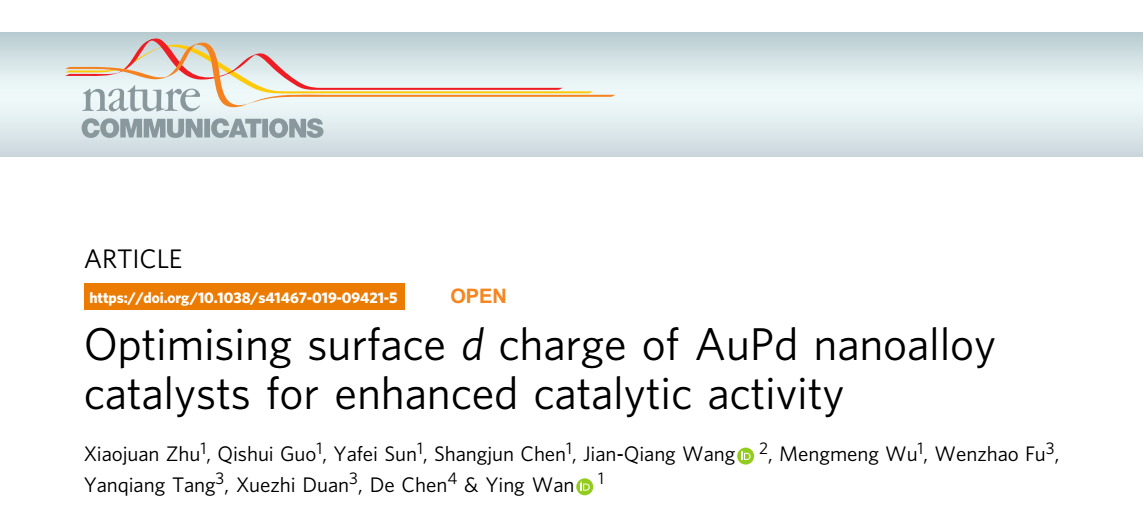 近日,上海师范大学卫星直播足球 万颖教授课题组在Nature子刊Nature Communications上发表题为“Optimising surface d charge of AuPd nanoalloy catalysts for enhanced catalytic activity”的论文,发现了实验测量的金属表面d带电荷密度作为催化活性的描述符,为催化剂理性设计提供基础。