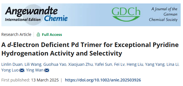 近日,免费足球直播app 万颖教授团队在《Angewandte Chemie International Edition》(IF = 16.1)上发表论文“A d-electron Deficient Pd Trimer for Exceptional Pyridine Hydrogenation Activity and Selectivity”,揭示了具有0.42d-电子缺失数的新型钯三聚体催化剂有效地实现了2-苯基吡啶到2-苯基哌啶的几乎完全转化,并且在循环使用的情况下保持了优异性能,几乎不损失活性和选择性。相关论文为阐明活性位点的电子和几何结构对活化熵和催化性能的影响机制,设计适合特定反应需求的高效催化剂铺平了道路。上海师范大学为第一署名单位,段林林博士,王丽丽博士,姚国华副教授为论文共同第一作者,上海师范大学万颖教授、北京化工大学罗勇教授为论文共同通讯作者。
