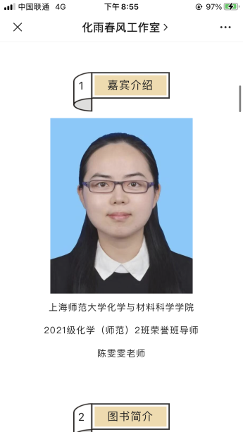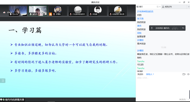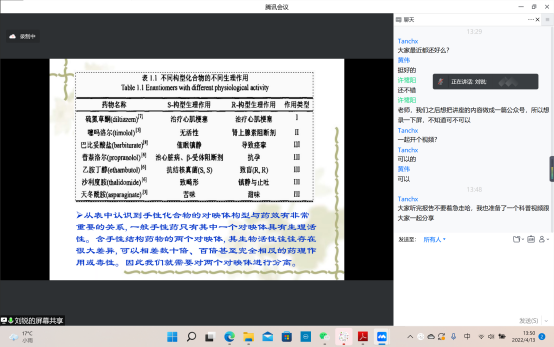 谭春霞老师邀请了香港城市大学博士后储丹丹老师和在读研究生朱元利,为化师4班同学带来学习、科研和工作经历的分享。通过交流分享,同学们进一步认识到要向优秀的老师、学姐看齐,不能因为线上学习就有所懈怠。谭春霞老师还邀请刘锐副研究员为班级同学带来科普讲座“生活中无处不在的手性”,并组织同学观看微电影《有机师姐》,让同学们了解了科研是什么、有什么意义,激发同学们对科研的兴趣。
