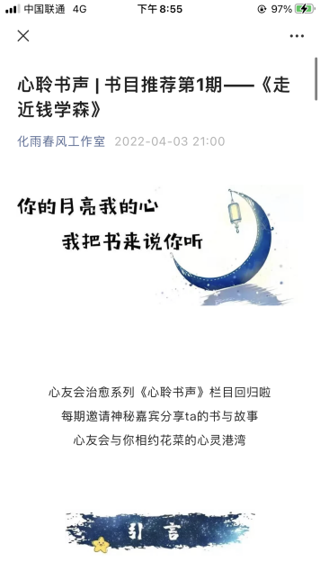 荣誉班导师还参与到卫星直播足球 心友会主办的“心聆书声”活动中,陈剑锋老师推荐了“两弹一星”功勋钱学森先生的传记——《走进钱学森》,鼓励同学们应以国家需求为己任,努力学好本领,为国家服务,为人民服务。陈雯雯老师向大家推荐《格局》一书,讲述自我对“格局”的理解,如何提升格局,如何调整心态尽快适应大学生活,如何在疫情防控期间修炼、提升自我。