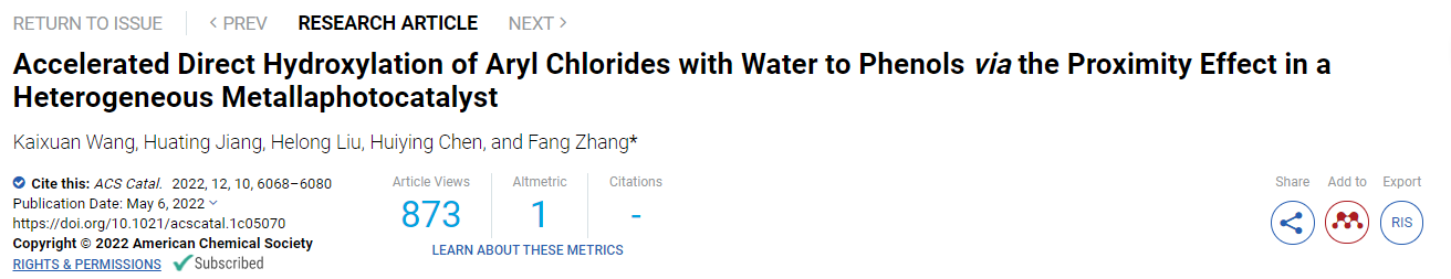 近日,我校卫星直播足球 张昉教授团队在光热协同催化领域取得重要进展,相关成果以 “Accelerated Direct Hydroxylation of Aryl Chlorides with Water to Phenols via the Proximity Effect in a Heterogeneous Metallaphotocatalyst”为题在《ACS Catalysis》上发表, 博士生王凯旋和蒋花婷为论文共同第一作者,张昉教授为论文通讯作者。
