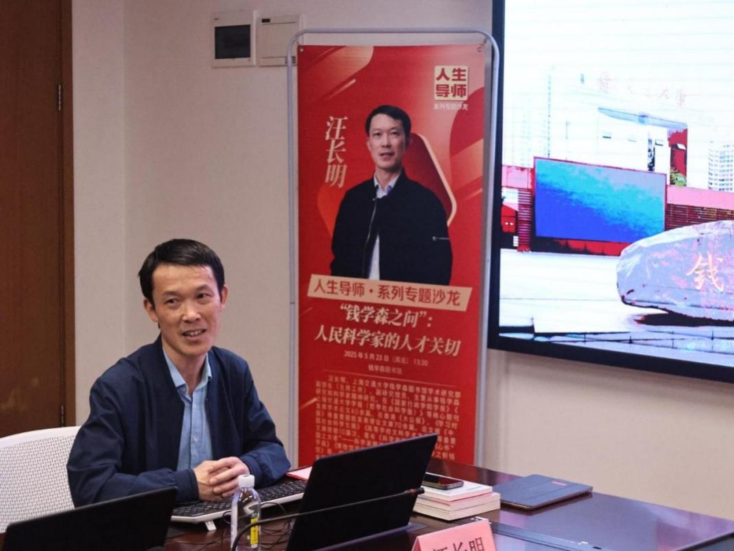 随后,汪长明老师以“‘钱学森之问’:人民科学家的人才关切”为主题为师生做讲座。汪老师从“钱学森之问”的肇始之源讲起,从“中国发展阶段论”“人才培养主体论”“人才培养目标论”“大学办学特色论”“人才成长规律论”五重思考,层层解析“钱学森之问”题中之义,强调了“科学技术发明创造人才”不仅是当下我国教育领域的核心议题,更是关乎我国长远发展的战略命题。汪老师结合自身研究,提出“钱学森之问”的破困之道,并向同学们寄语:“社会主义建设需要更多的钱学森,国家才会有大的发展”。他号召同学们以时代为卷、以青春作笔,主动回应“钱学森之问”,永葆独立思考的锋芒,将科学家精神落实到学习和生活中,“每个人都能成为破题者,每一个都能成为答案!”