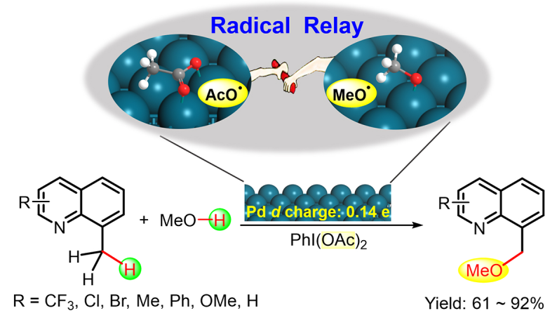 该文利用课题组前期报道的d电荷密度描述符设计策略(Nat. Commun., 2022, 13, 2754; Nat. Commun., 2020, 11, 4600; Nat. Commun., 2019, 10, 1428; Natl. Sci. Rev., 2021, 8, nwaa126),设计了多相Pd催化剂,通过催化自由基接力反应,实现杂环芳烃C(sp3)-H键直接氧化交叉偶联生成醚。Pd纳米颗粒高度分散在有序介孔N掺杂锐钛矿纳米晶-碳复合材料上;且Pd与N掺杂锐钛矿纳米晶之间的金属-载体强相互作用,增加了Pd的d电荷密度。d电荷密度为0.14 e的缺电性Pd表面,PhI(OAc)2通过单电子转移反应产生乙酰氧基自由基,吸附的甲醇通过自由基接力转化成为甲氧基自由基;同时,其有利于吸附8-MeQ并活化苄基位C(sp3)-H键。进一步甲氧基自由基插入活化的C(sp3)-H键发生脱氢交叉偶联,形成C-O键。这种表面吸附诱导自由基接力机制完全不同于传统均相PdII催化C-H键氧化交叉偶联反应。后者通常涉及配体定向活化C-H键形成环钯中间体,通过PdIII-PdIII二聚体环钯中间体双电子氧化产生PdIV,形成C-O键。在8-甲基喹啉C(sp3)-H键氧化交叉偶联反应中,多相Pd催化剂的转化频率高达84 h-1,8-甲氧甲基喹啉的选择性>99%。进一步拓展底物范围,发现该催化剂对喹啉类化合物都具有高的活性。同时,催化剂展现高的稳定性,7次反应后几乎检测不到催化剂活性下降和金属Pd流失。