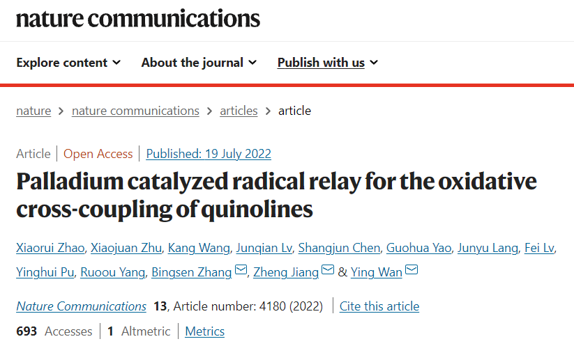 近日,我校卫星直播足球 万颖教授团队在Nature子刊《Nature Communications》上发表论文 “Palladium catalyzed radical relay for the oxidative cross-coupling of quinolines”,钯催化自由基接力实现喹啉高效氧化交叉偶联反应。上海师范大学为第一署名单位,17级博士生赵小瑞、卫星直播足球 青年教师朱小娟为论文共同第一作者,上海师范大学万颖教授、中国科卫星直播足球 上海高等研究院姜政研究员,中国科卫星直播足球 金属研究所张炳森研究员为论文共同通讯作者。