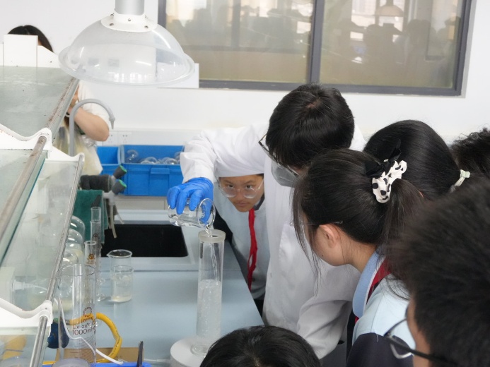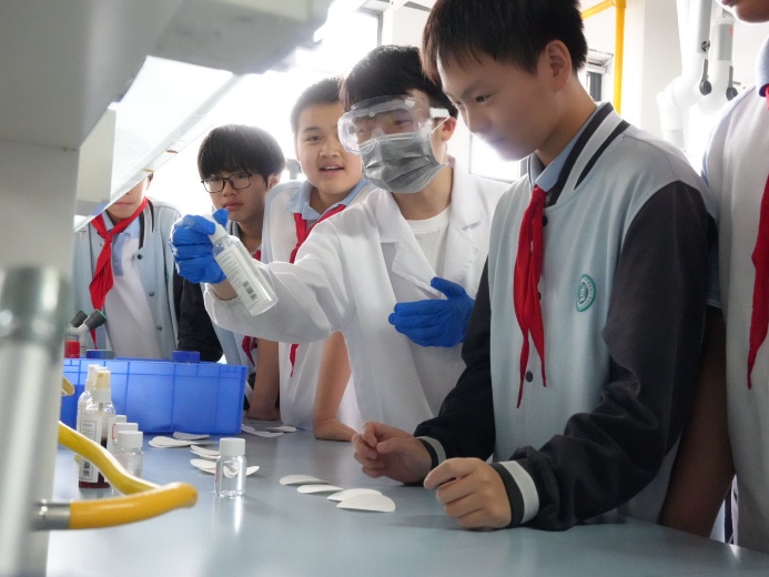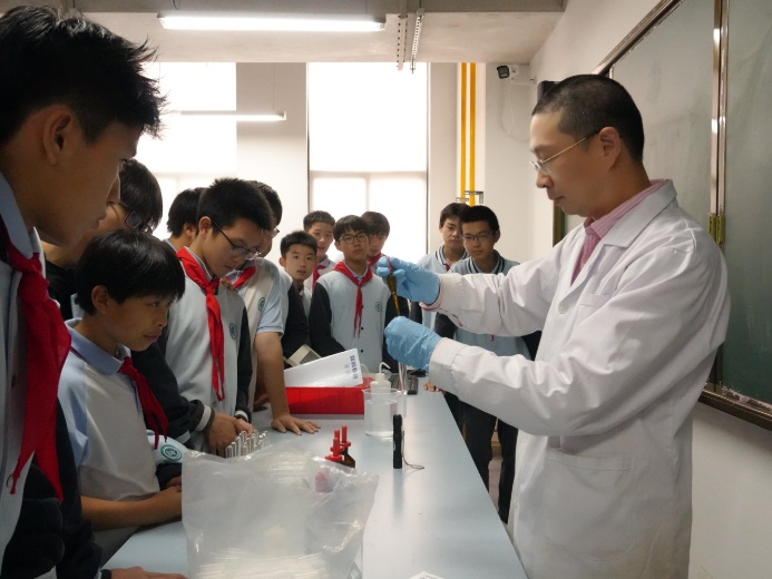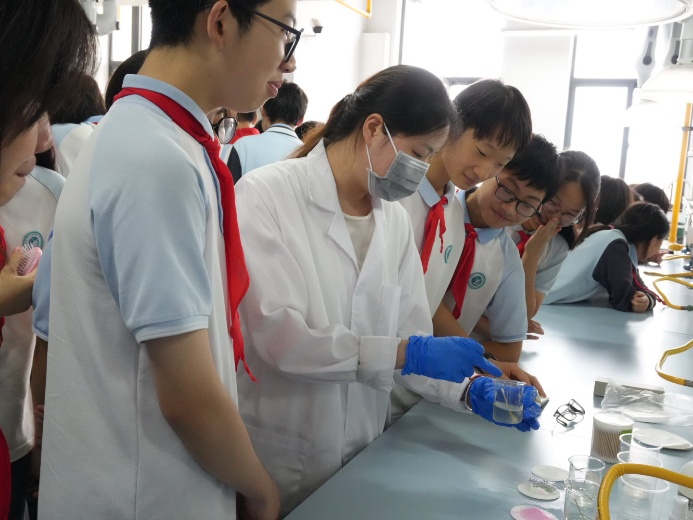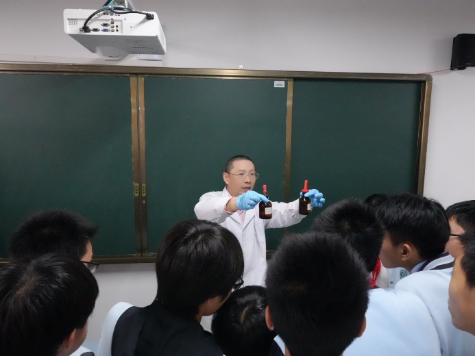 活动的高潮在中学化学实验研究实验室上演。经过与指导老师的反复打磨和精心准备,四位研究生讲师为同学们奉上了一场精彩纷呈的化学实验秀。