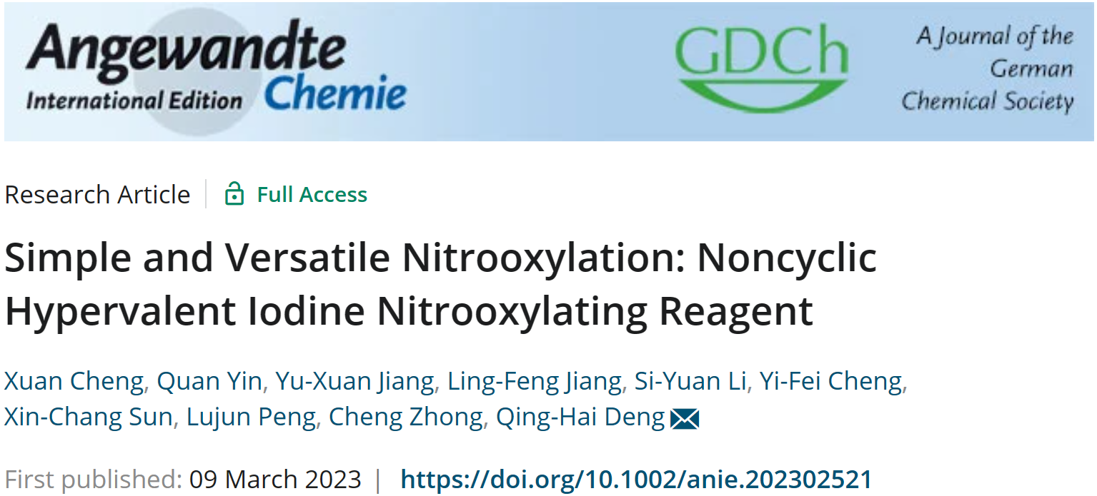近日,卫星直播足球 邓清海教授团队在Angewandte Chemie International Edition (IF = 16.8)上发表论文“Simple and Versatile Nitrooxylation: Noncyclic Hypervalent Iodine Nitrooxylating Reagent”,发展了一类新型非环高碘硝酸酯化试剂,为硝酸酯的安全、绿色、高效制备提供了新方法。上海师范大学为唯一通讯单位,我校2021级博士生成轩为第一作者,邓清海教授为论文通讯作者。