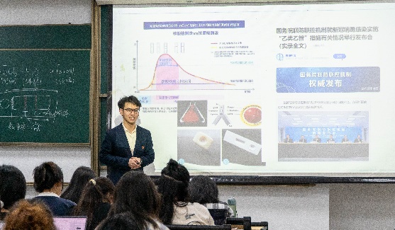 杨亦颉从课本中的胶体这一知识点出发,拓展到我们身边常见的新冠抗原检测试剂盒,其所运用的原理——胶体金法。他配合多媒体、漫画,生动细致地从制备方法、反应原理和胶体金的应用三个方面讲解了过滤实验、电泳实验、聚沉实验等内容,并且现场用胶体金样品给同学们演示了胶体的丁达尔效应实验。胶体金的用途广泛,在疫情防控中发挥了重要作用,在肝炎、手足口病等各种疾病的检测中也有广泛应用。通过杨亦颉的讲解,同学们深入地了解了胶体金的性质和应用,也激发了对于科研的兴趣和热情。